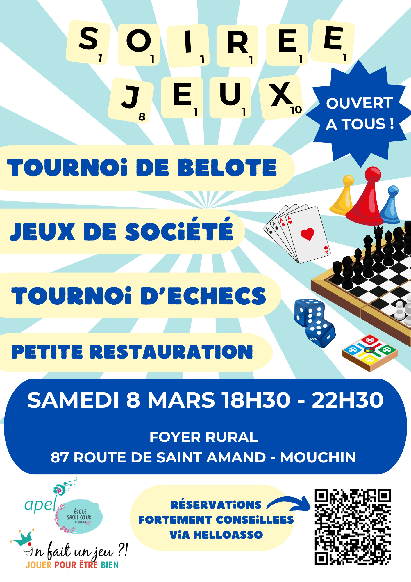 L’APEL de l’école Sacré-cœur de Mouchin organise une soirée jeux, en partenariat avec On fait un jeu ?! Au programme, un tournoi de belote, un tournoi d’échec et de nombreux jeux de société pour tous !