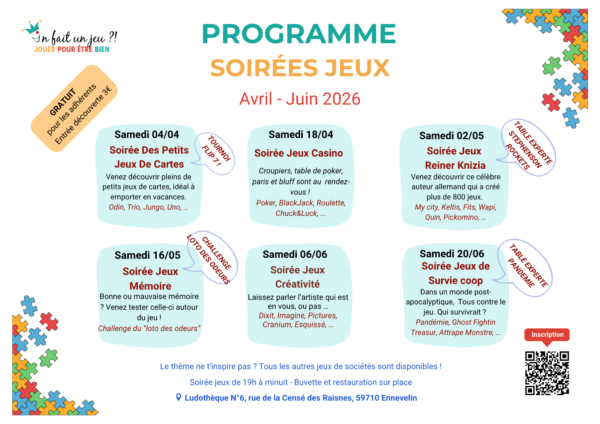 - Programme trimestriel des soirées jeux à la ludothèqueLes soirées thématiques de Janvier à Mars 2026 Découvrez le nouveau programme trimestriel des soirées jeux adhérents et ces thématiques ludiques, de Janvier à Mars 2026 ! Nous vous proposons des soirées… Lire la suite : Programme trimestriel des soirées jeux à la ludothèque