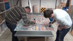 Les voilà maintenant avec un puzzle de 5000 pièces mesurant 153×101 cm.  Que faire de ce puzzle très riche en détails?  L’équipe de « On Fait Un Jeu » a une idée! En faire un jeu d’observation.