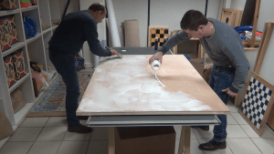 Nous avons enfin attaqué l’étape la plus délicate : le transfert du puzzle sur le support final. Cette étape est délicate car il faut positionner rapidement (sinon la colle sur le bois sèche trop vite et ne colle pas) et précisément (car on ne pourra pas bouger le puzzle de plusieurs centimètres dès son transfert) le puzzle. Patience et self-contrôle !!