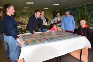 Mais comment on transport un puzzle de 5000 pièces en plus pas terminé? Grâce à Jeanne-Marie, adhérente et adepte de grands puzzles, voilà nos aventuriers en train de glisser un grand bulgomme sous le puzzle puis de l’enrouler. Oui oui vous avez bien lu, ils l’ont enroulé!