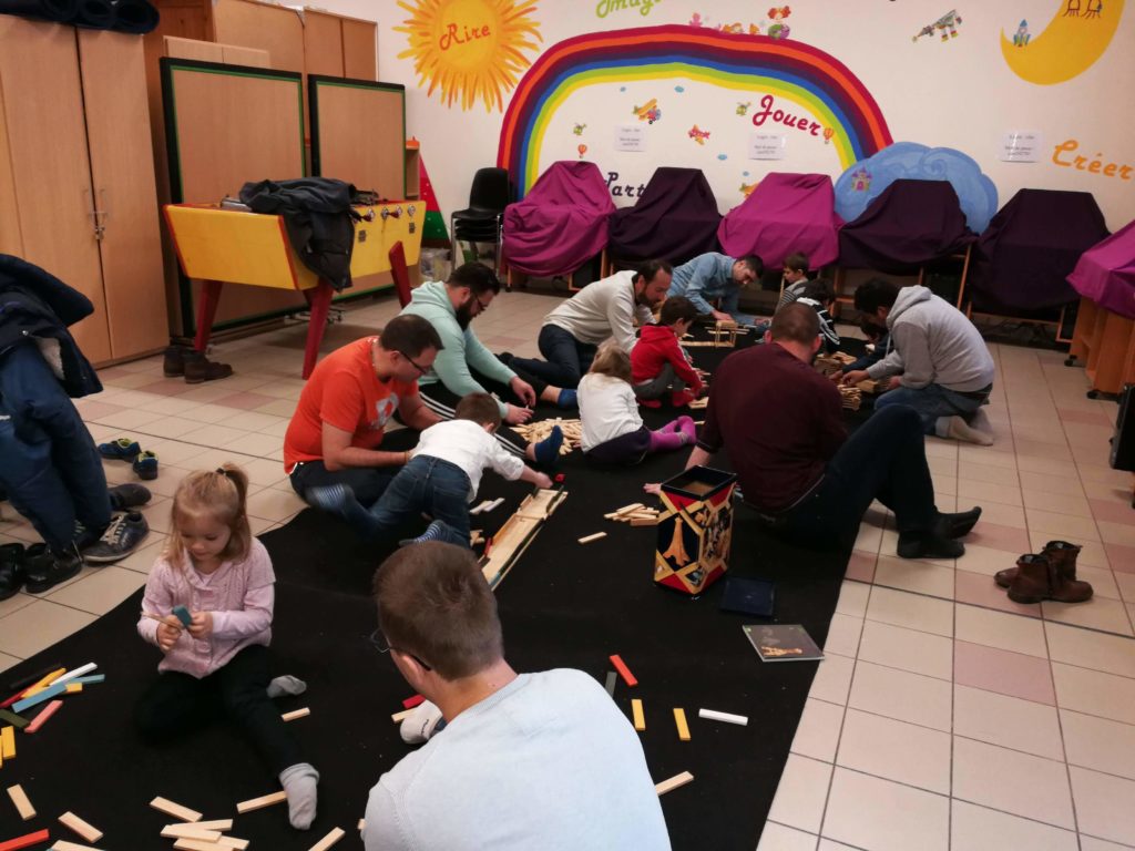 Les ateliers parents enfants en centre social sont de plusieurs nature comme les photos ci-dessous. On peut animer des temps de jeux en famille, ou le jeu de société s’y prête très bien. On peut organiser des temps spécifiques pour les papas et leurs enfants ; les papas sont peu nombreux habituellement en ateliers. Un atelier construction en a réuni près d’une dizaine !