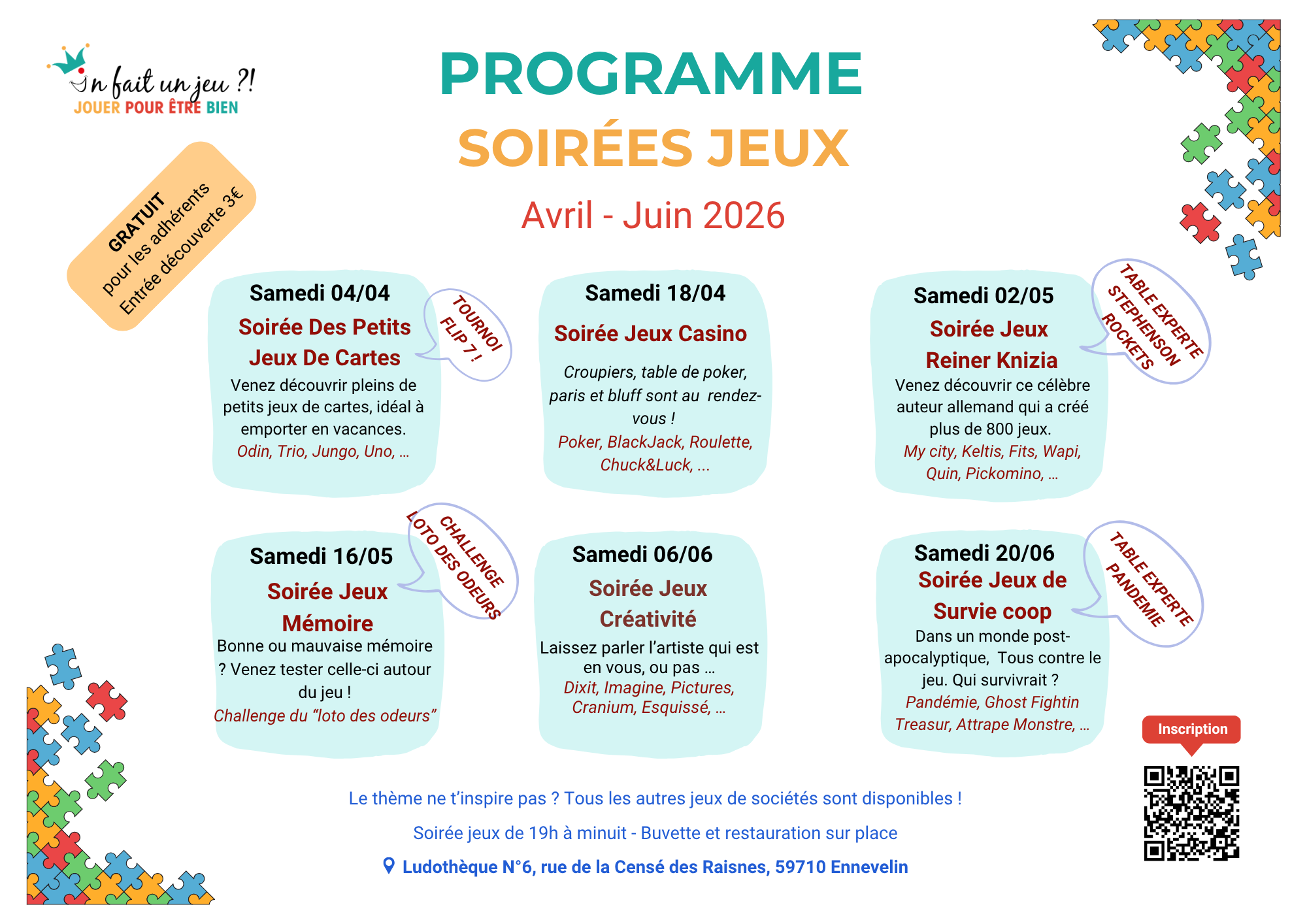 Découvrez le nouveau programme trimestriel des soirées jeux adhérents et ces thématiques ludiques, de Janvier à Mars 2026 ! Nous vous proposons des soirées à thèmes. Ces soirées jeux nous permettent de tous nous retrouver, d’échanger, de jouer et de s’amuser !